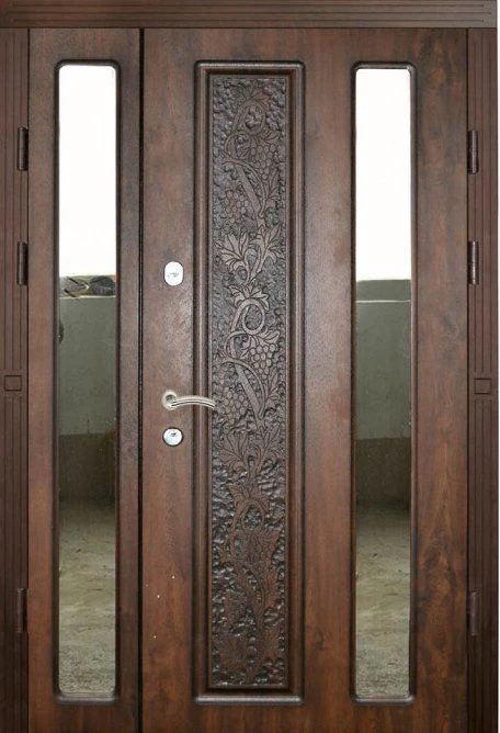 Поскольку в большинстве случаев устанавливаемые на входе в коттедж двустворчатые двери являются еще и предметом интерьера, украшающим здание, их дизайну предается особое значение. Эти двери, как правило, отделываются атмосферостойким МДФ, натуральным шпоном, массивом. Эффектно на таких дверях смотрится витражный узор, применение ковки, зеркальных элементов. Вариантов декора входной двустворчатой двери масса, тут все зависит от пожеланий заказчика.